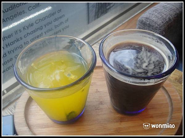 果汁是百香果, 還看得到果粒, 香甜好喝, 咖啡友人則來不及享用, 我只好包了...