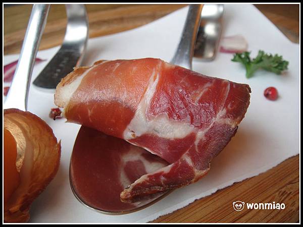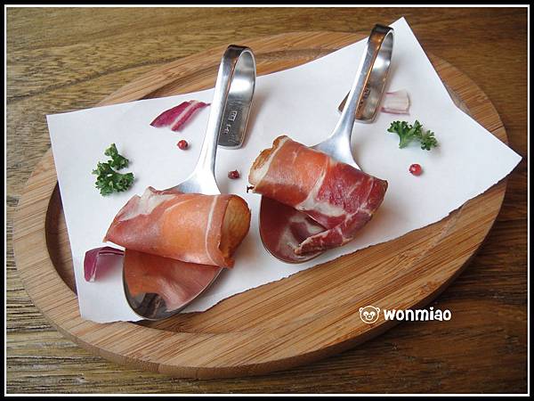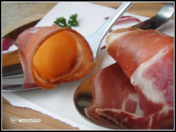 煙燻火腿肉片裡頭捲了哈蜜瓜, 可以連同裝點用的巴西里葉及紅胡椒粒一起吃更增添美味!