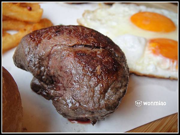 人氣推薦餐點之一的「爐烤牛排佐太陽雙蛋」, 是特選的菲力牛排, 切開後裡頭呈現漂亮的粉紅色,