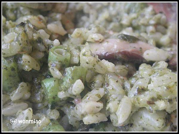 以青醬做成的燉飯, 口味不會太重, 米粒軟硬適中, 裡頭還吃得到四季豆丁及新鮮香菇,