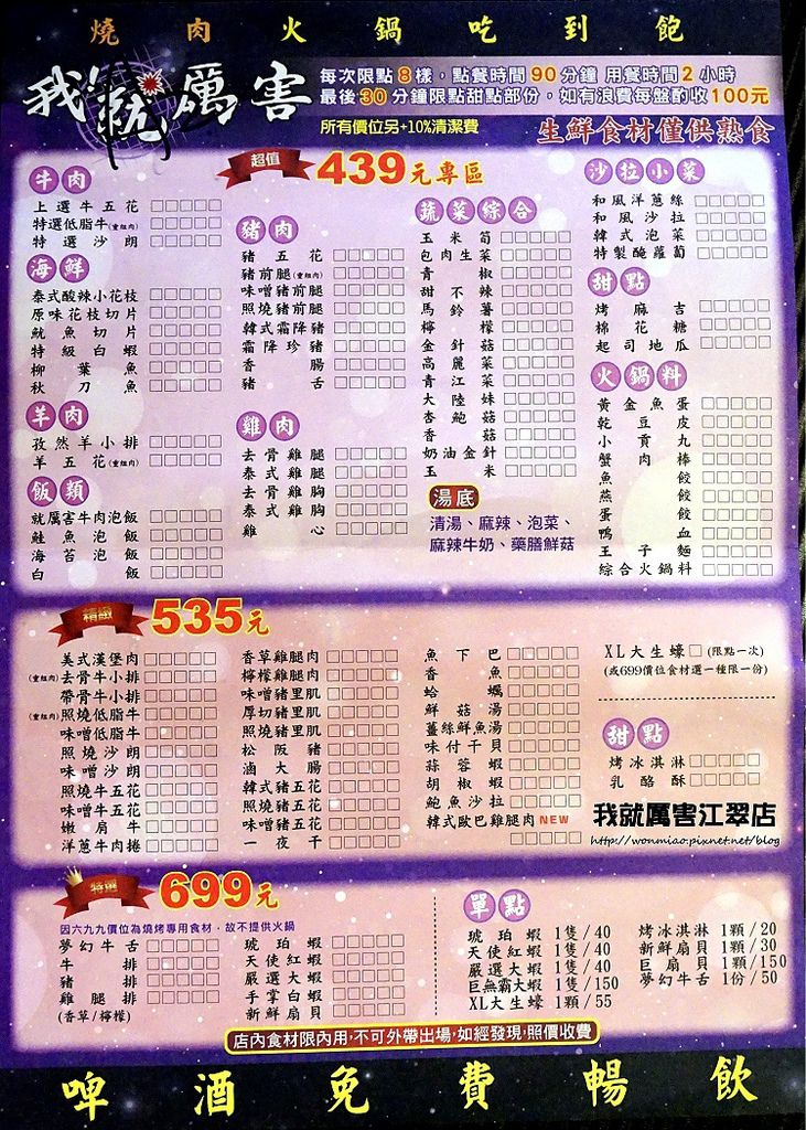 價位有分成439元,535元及699元(10%另計),699什麼都可以點(除了火鍋外),