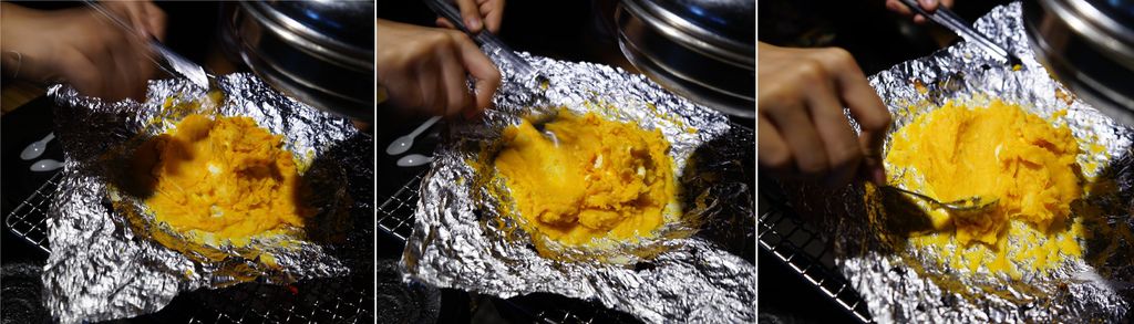 搞工的起司地瓜必須邊烤邊攪拌,將地瓜及起司於因熱度而溶化時快速不間段的攪拌在一起,