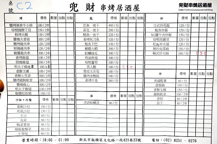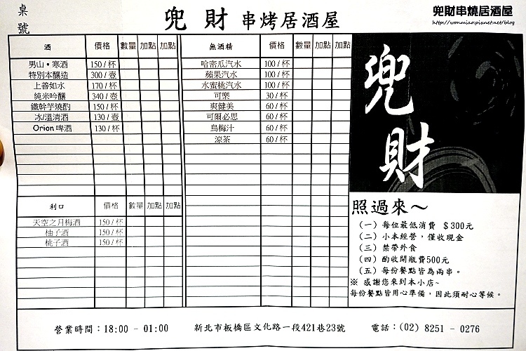 兜財串燒居酒屋位於捷運新埔站鬧中取靜的巷弄中,食材新鮮,提供多樣性的平價料理,