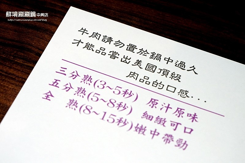 桌面上的紙墊貼心提醒大家怎麼燙出最好吃的牛肉片。
