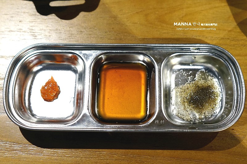 最右邊的韓式辣椒醬,吃來並不會很辣且有味噌的味道,適合沾點在生菜包肉內。