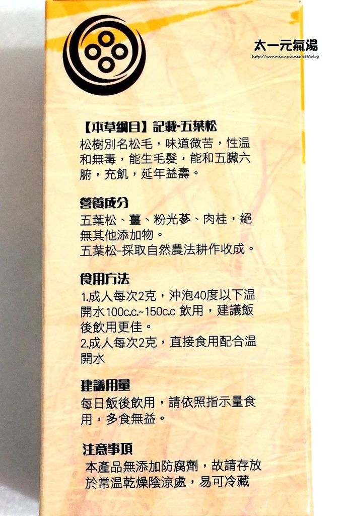 外包裝盒上有本草綱目對於五葉松的記載,