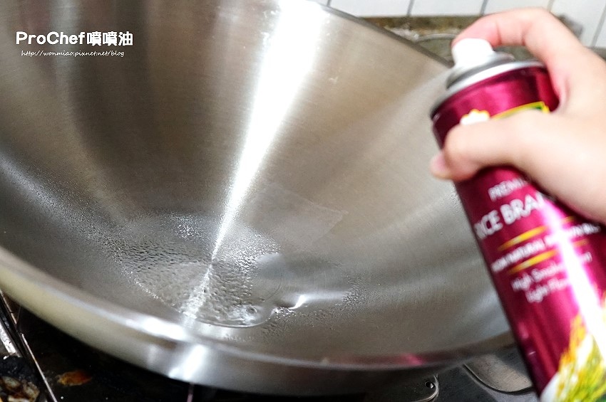 開火前,將ProChef噴噴油距離炒菜鍋約20公分的位置,均勻噴灑至鍋內。