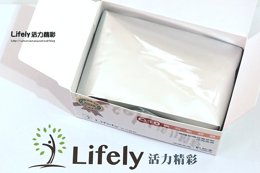 Lifely活力精彩Q10複方輹方軟膠囊包裝盒外以一層塑膠膜密封好,