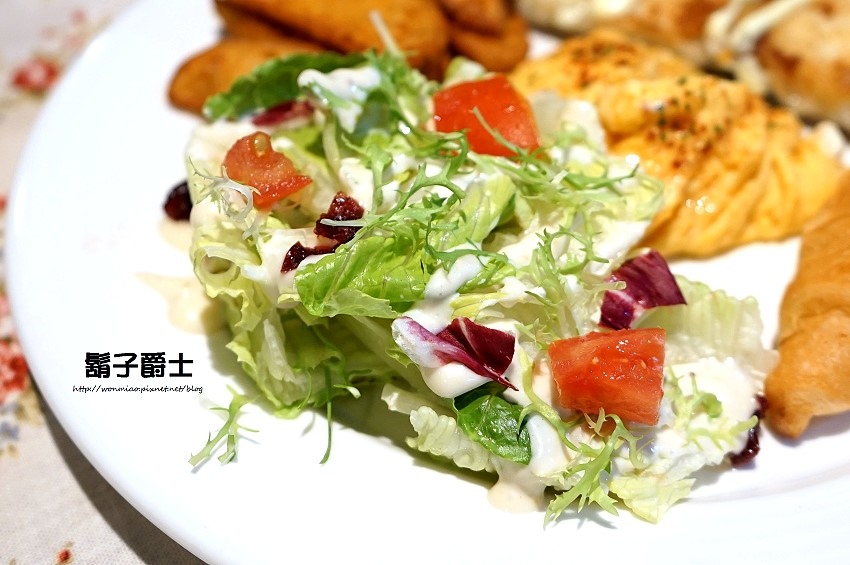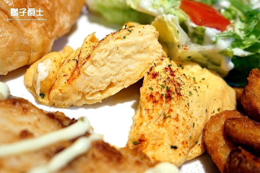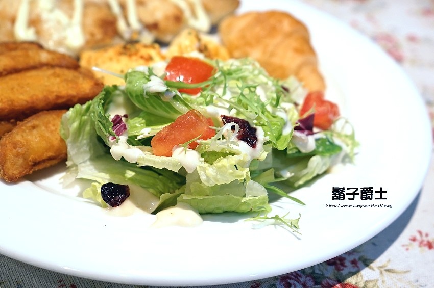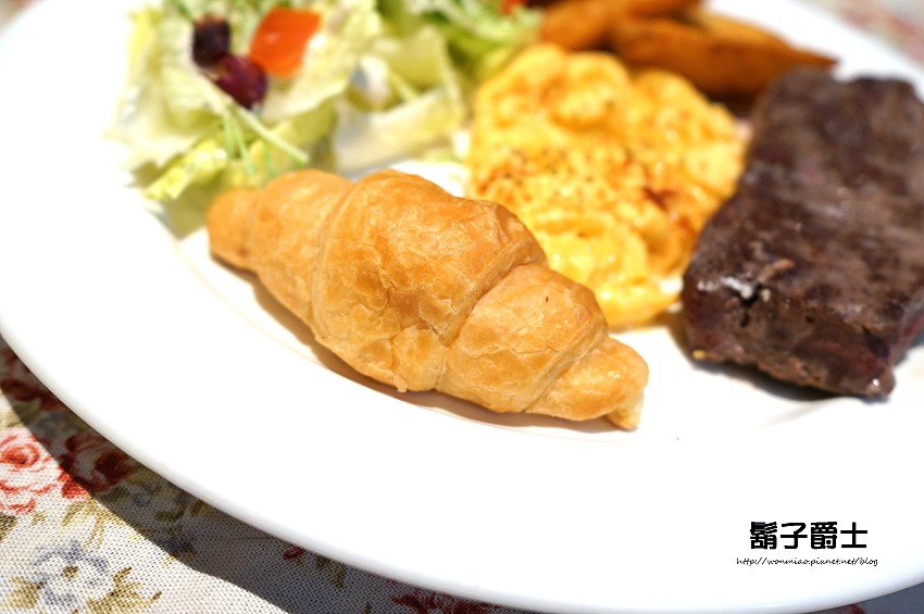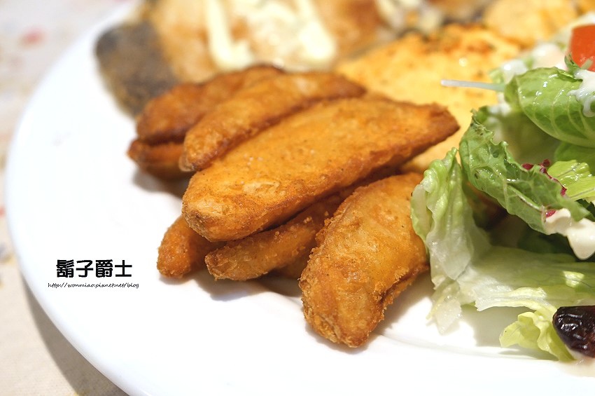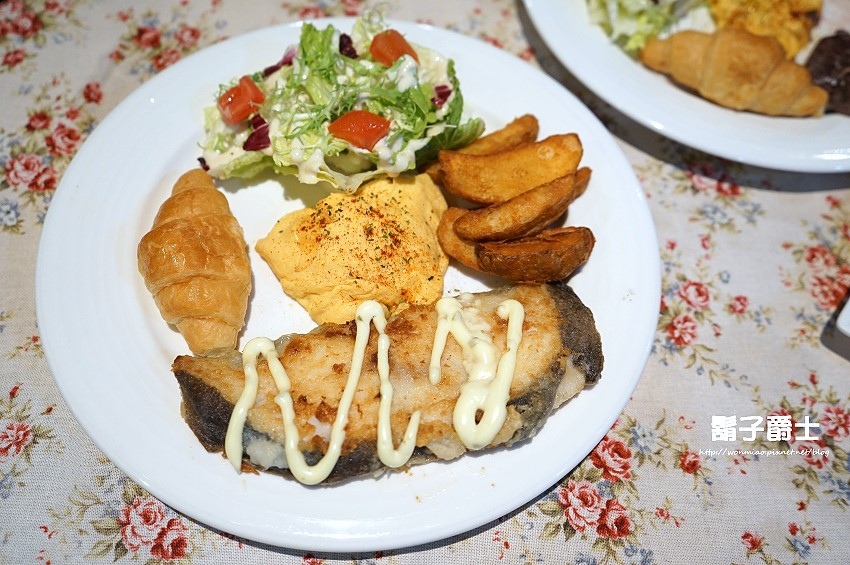 比汪喵的手還要大的鱈魚排,一旁搭配了生菜沙拉,帶皮薯塊,起司歐姆蛋及小可頌,