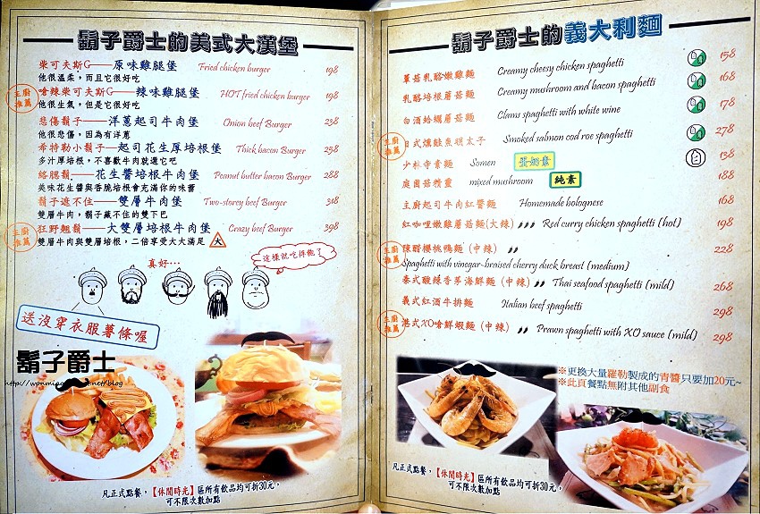 鬍子爵士價位親民,菜色豐富,有豐盛套餐,也有單點主食,小點心及各式飲品,