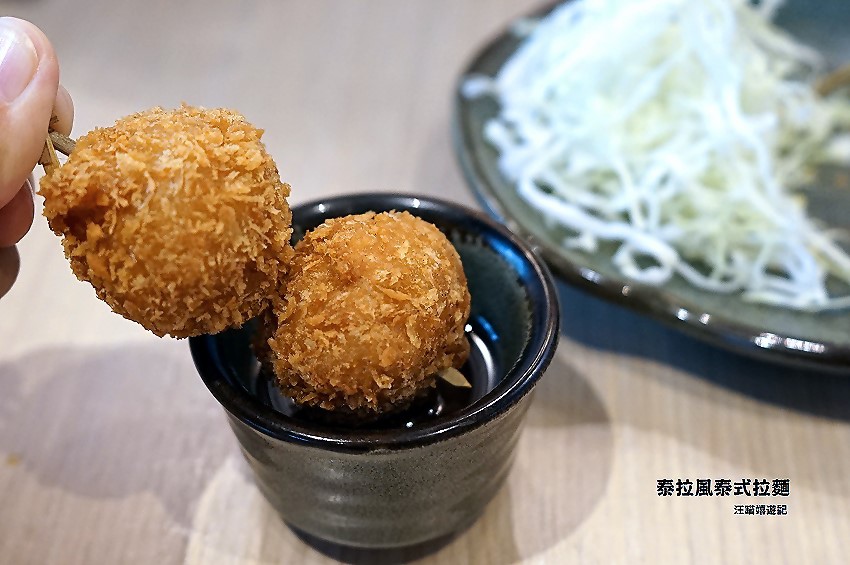 炸得金黃酥脆,2顆一串,搭配脆甜的高麗菜,讓人看了食指都要大動起來!!