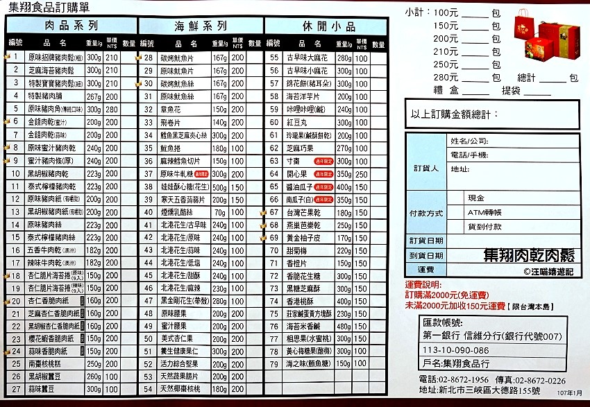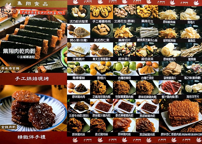 除了肉乾肉鬆肉捲外,集翔食品還有各種堅果,果乾,魷魚絲.....,