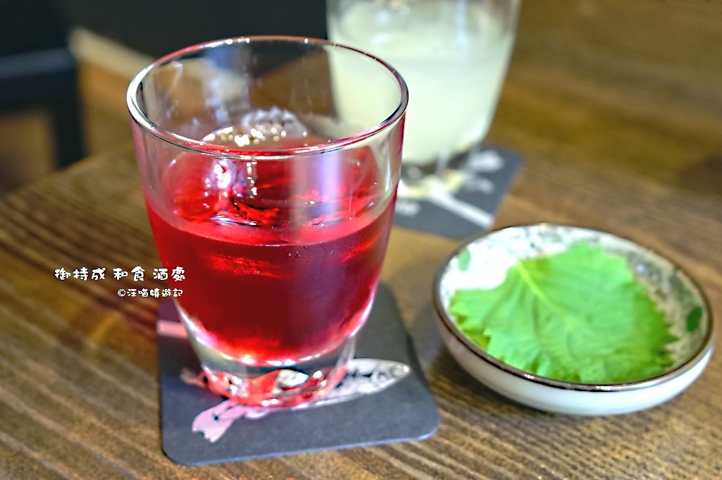 色澤相對艷麗的紫蘇梅酒,同時還附了一片翠綠的紫蘇葉。